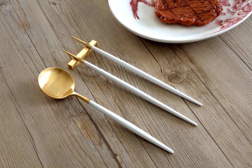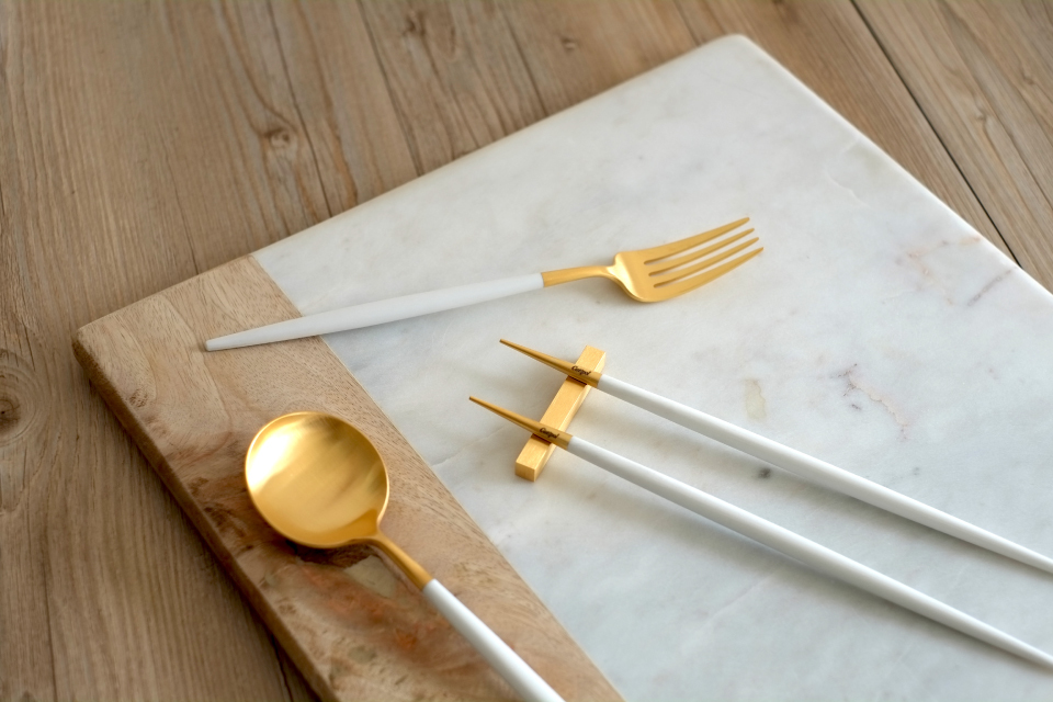 在某些饕客眼中,美食會散發著耀眼光芒,勢必要搭配金色與白色創造出的華麗風格,來自葡萄牙品牌Cutipol 擁有專業知識與工藝技術,堅持素材原料的嚴選,人體工學的考量,兼具清新、實用、精緻的設計,製作出符合挑剔美食家所期望中的刀叉餐具。