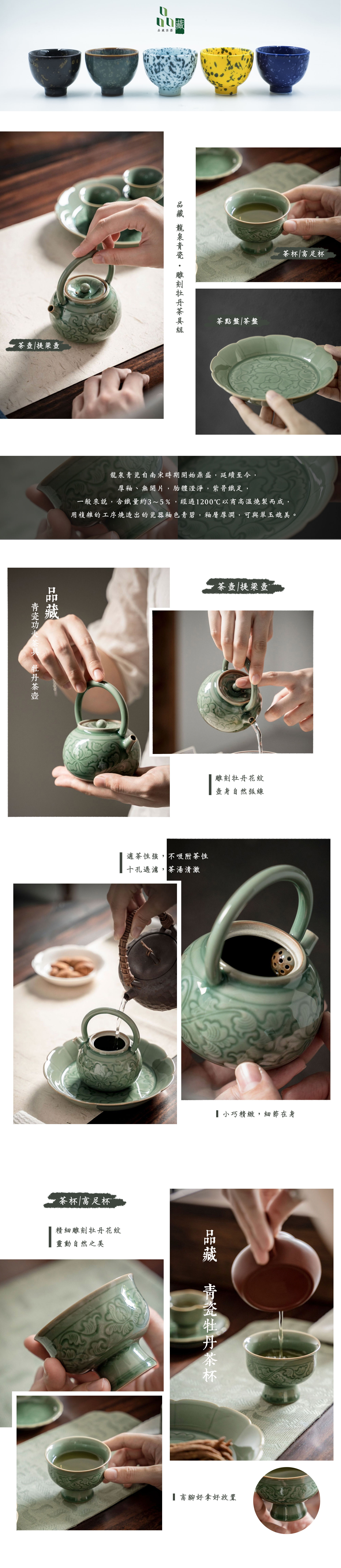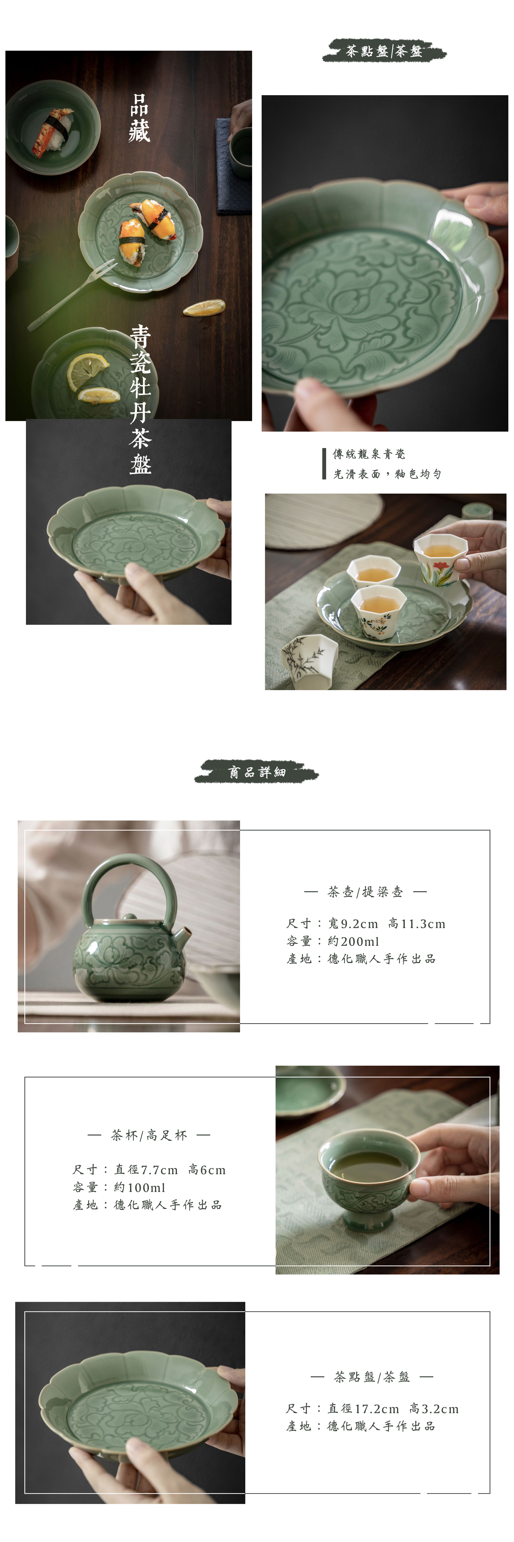 龍泉青瓷功夫茶具 雕刻牡丹茶壺 / 茶杯 / 茶盤