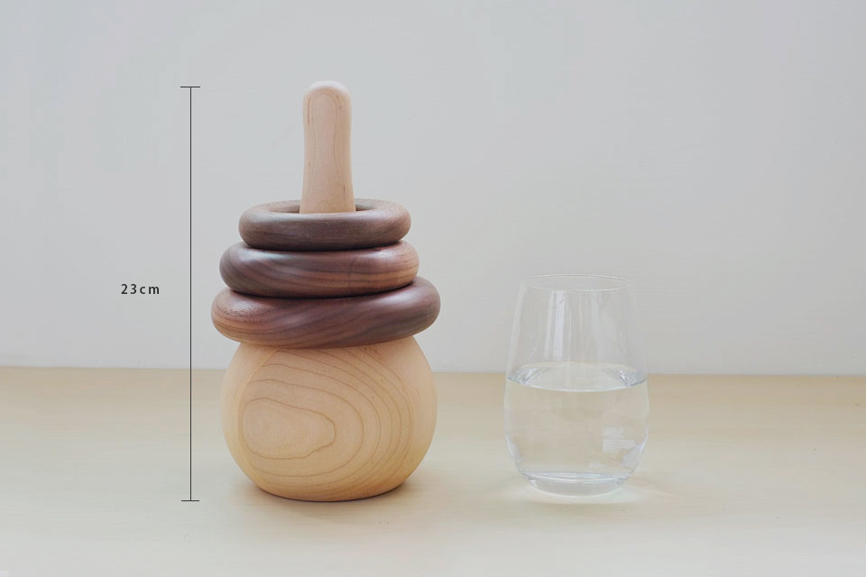 大小不同的木環,可以練習雙手至單手的抓握能力,每組色澤皆獨一無二的唷!