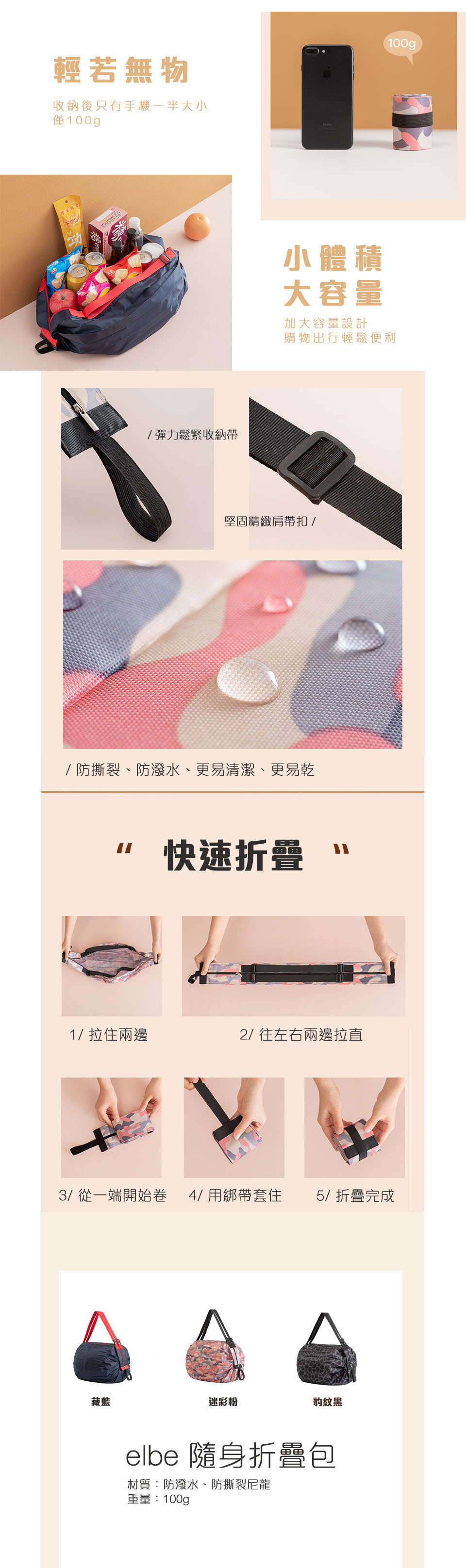 elbe 防潑水/防撕裂 折疊式隨身收納包/購物袋 (三色可選)