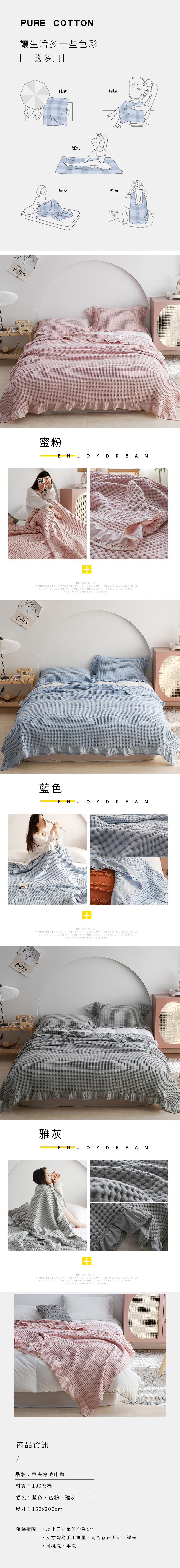 烘乾蓬鬆-利用棉纖維的特性,搭配華夫格結構,使毯子更加柔軟