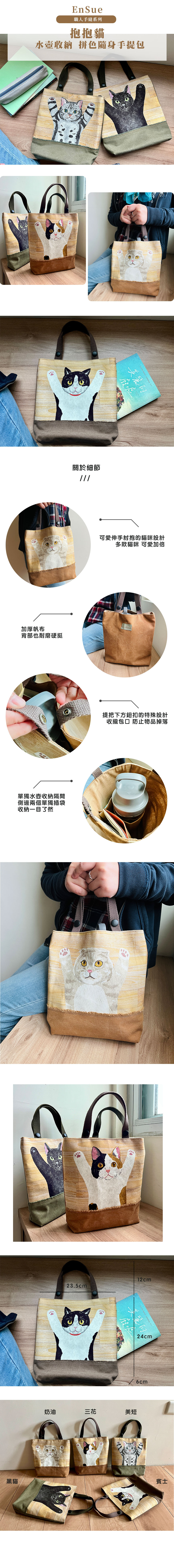 EnSue 職人手縫系列 抱抱貓 水壺收納 拼色隨身手提包(5款可選)