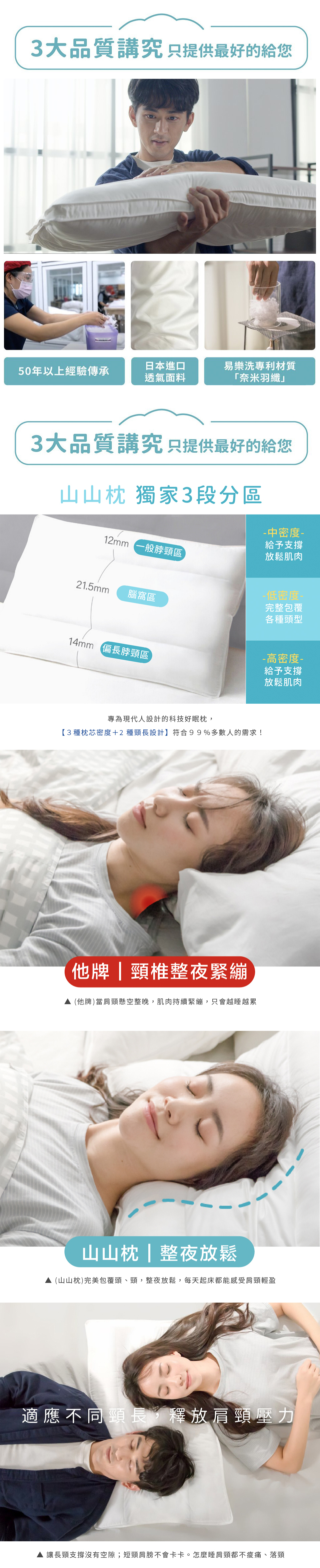 三種枕芯密度+兩種頸長設計,符合多數人需求,
