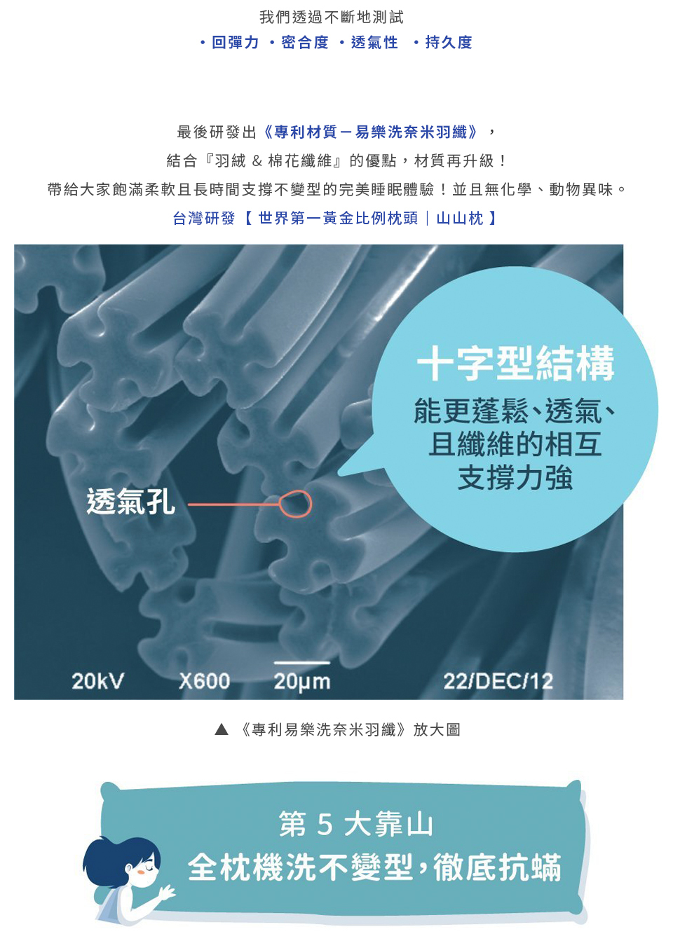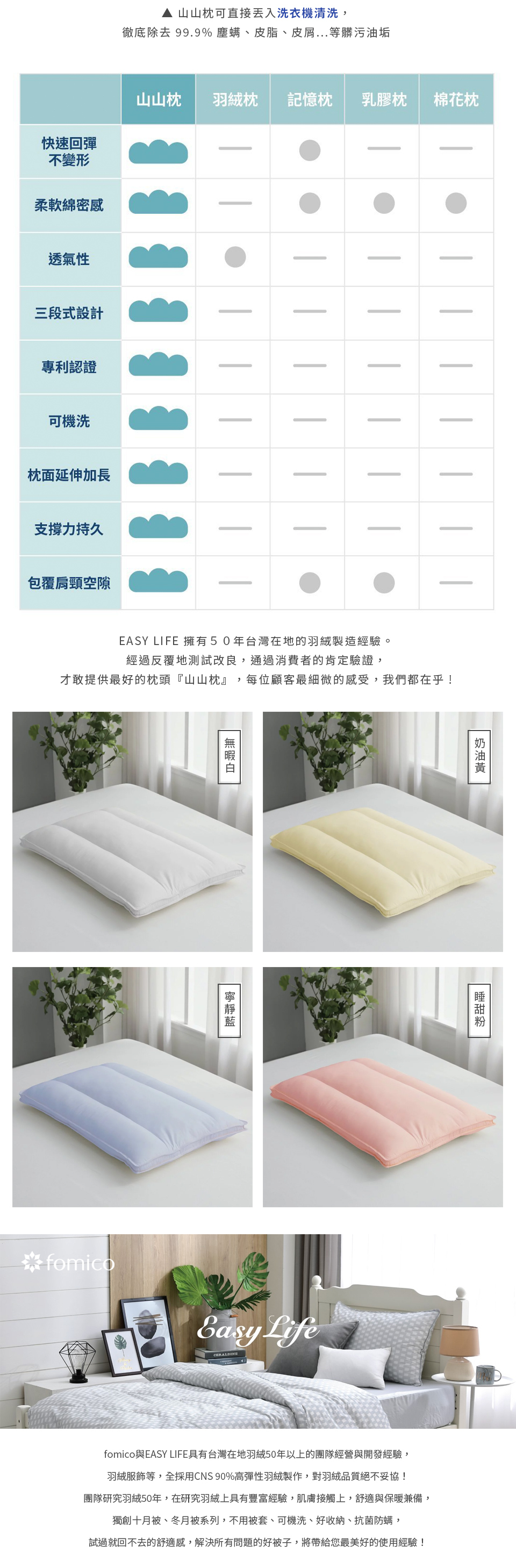 枕芯採用『專利易樂洗奈米羽織』彈力支撐,透氣不變形,