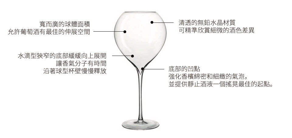 適用於紅、白酒。不僅能充分展現出花香 & 果香 & 風土 (terrior),也能細膩刻畫酒體 & 皮革 & 香料 & 木桶。