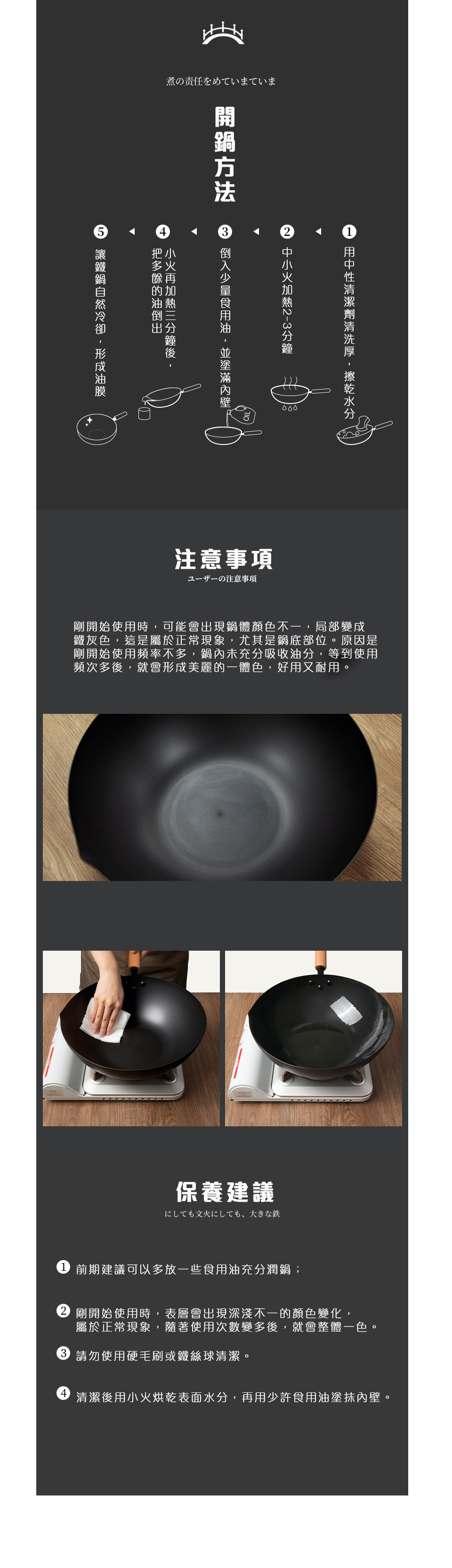 鐵鍋無任何化學塗層,保養簡單,使用後清洗乾淨擦乾水份,即可達到防鏽效果。
