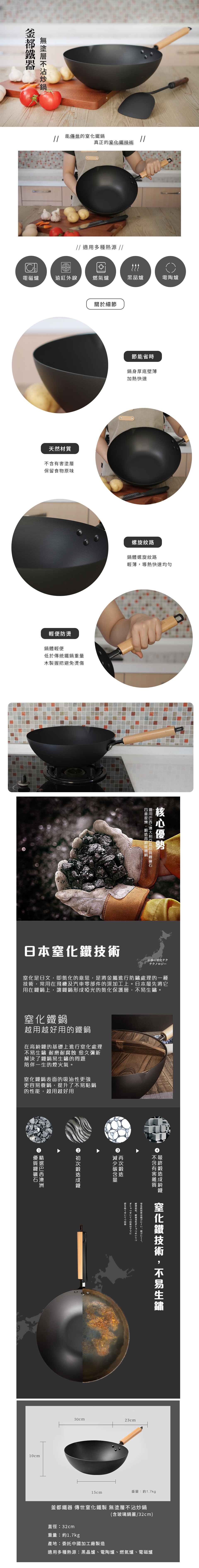 釜都鐵器 傳世窒化鐵製 無塗層不沾炒鍋 (含鍋蓋/32cm)