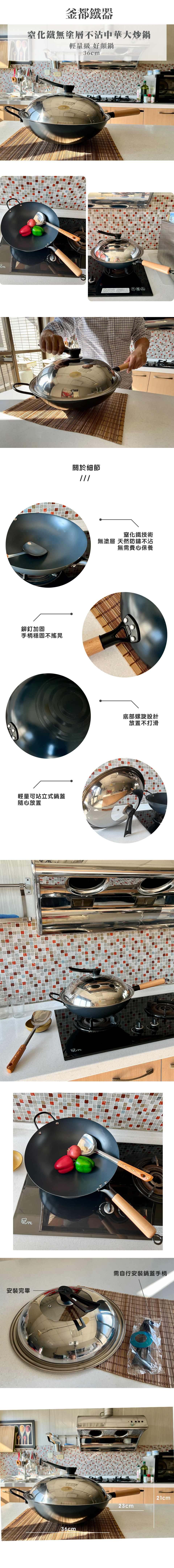 釜都鐵器 窒化鐵無塗層不沾中華大炒鍋 36cm (輕量級 好顛鍋 玻璃鍋蓋)
