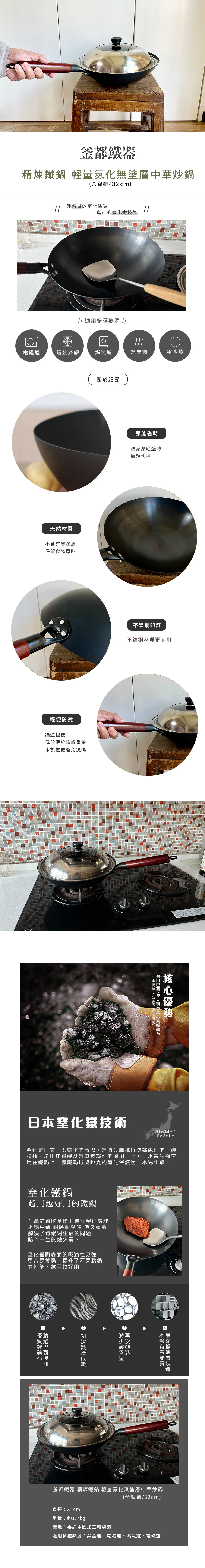 釜都鐵器 精煉鐵鍋 輕量氮化無塗層 圓釜鍋底中華炒鍋 32cm (不含鍋蓋)