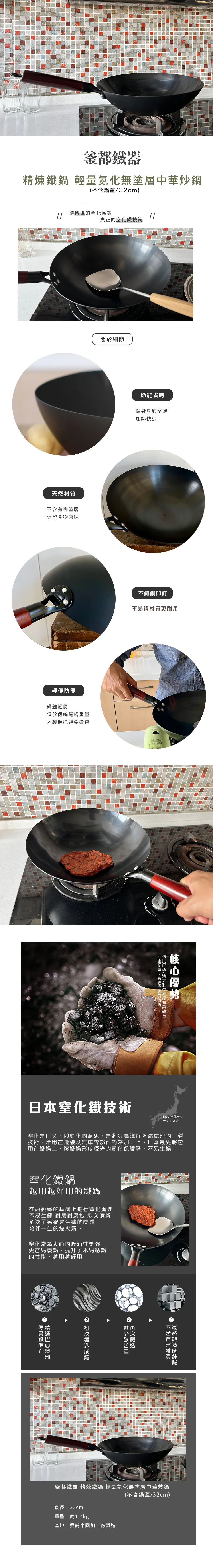 釜都鐵器 精煉鐵鍋 輕量氮化無塗層 圓釜鍋底中華炒鍋 32cm (不含鍋蓋)
