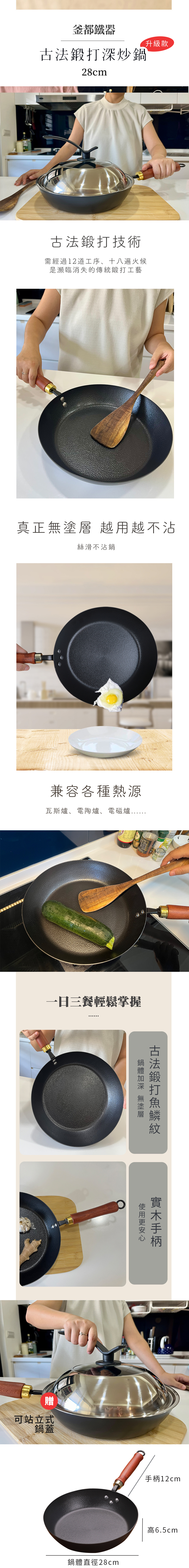 [升級新款] 釜都鐵器 古法鍛打錘紋 深炒鍋 (28cm/贈可站立式鍋蓋)