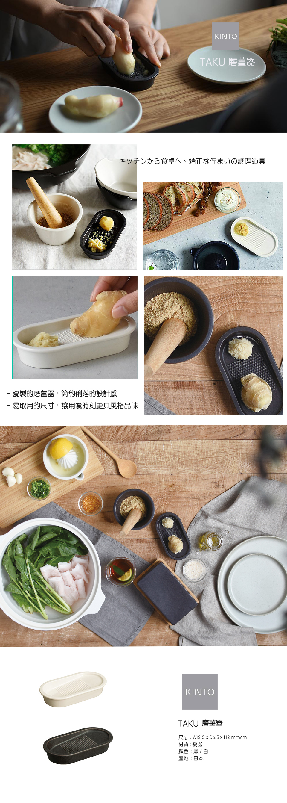 瓷製的磨薑器、檬榨汁器、研磨缽,強調安定的設計感,