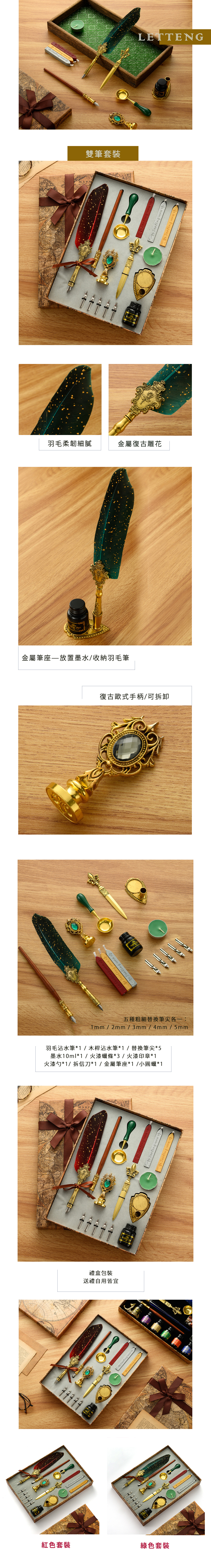 內含:羽毛沾水筆*1 / 木桿沾水筆*1 / 替換筆尖*5 / 墨水10ml*1 / 火漆蠟條*3 / 火漆印章*1 / 火漆匙*1/ 拆信刀*1 / 金屬筆座*1 /小圓蠟*1