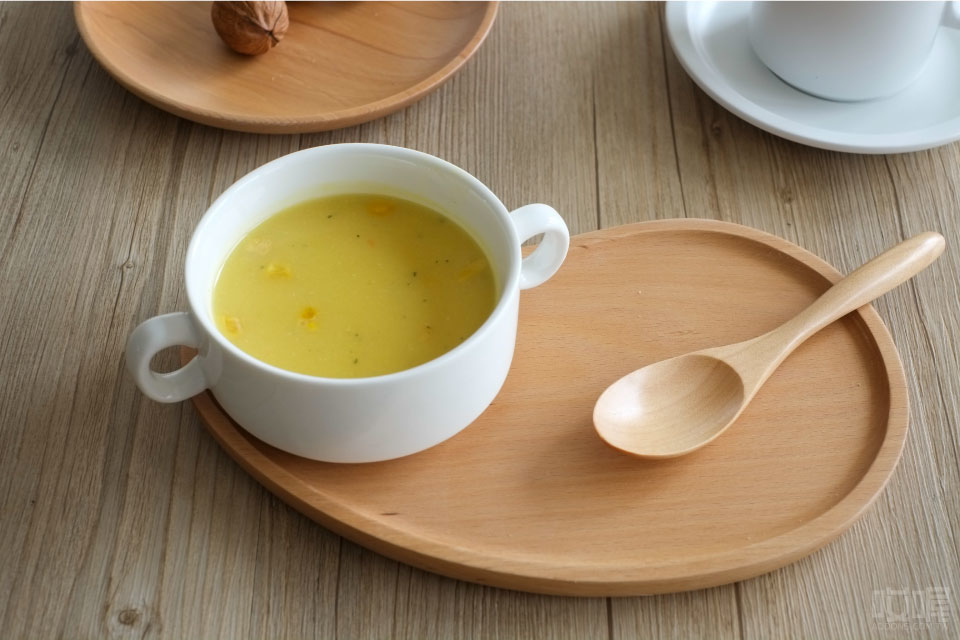 托盤以橡膠原木一體成型,搭配上白瓷的湯碗以及原木湯杓,