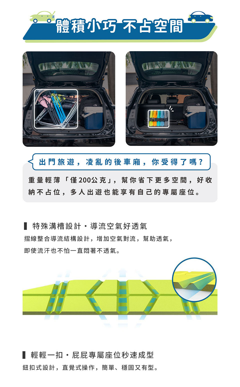 機能坐墊新體驗,摺紙概念設計,秒速收合,操作簡單。