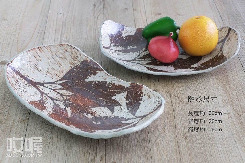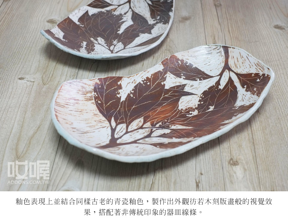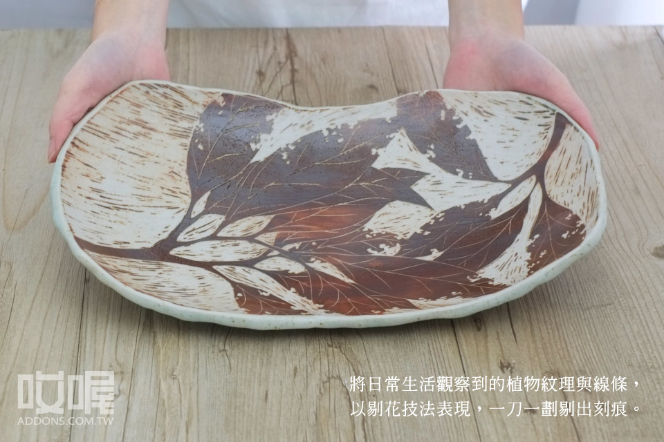 使用特殊少見的剔花技法將植物自然的姿態勾勒在手工製作的陶瓷盤上,