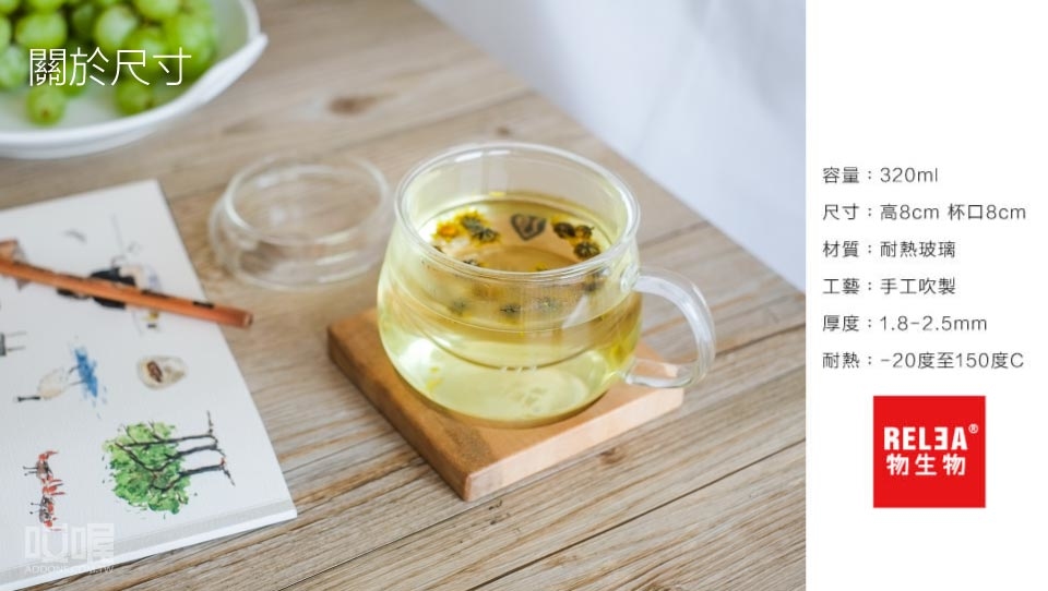 一款專為泡茶所設計的玻璃茶杯,渾圓自然的杯身曲線,