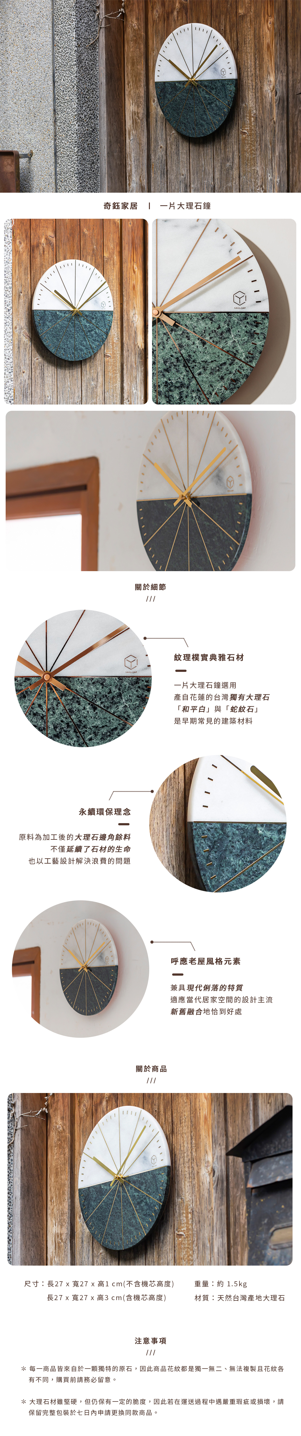 【台灣綠工藝】奇鈺家居 一片大理石鐘