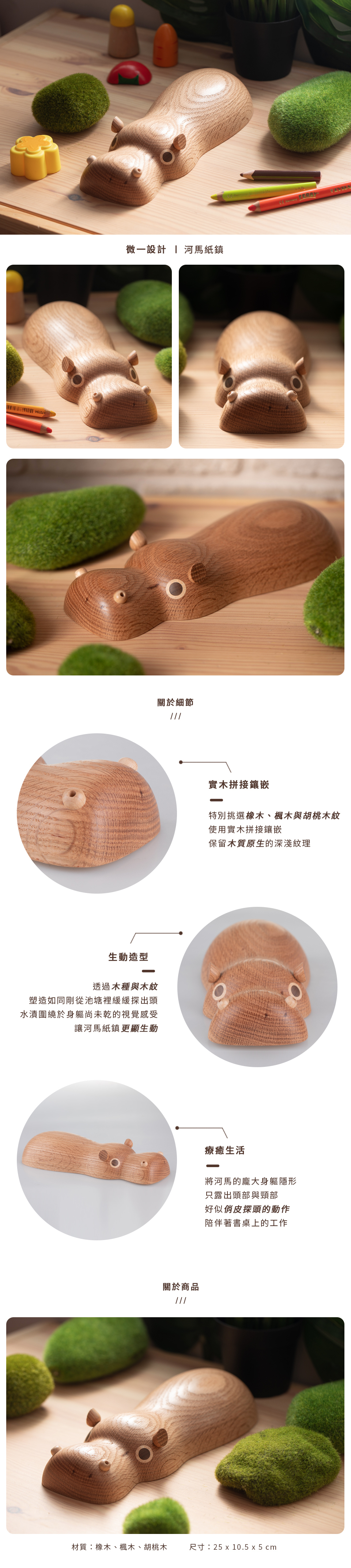 河馬紙鎮為紀念該河馬的文創工藝創作,特別挑選橡木、楓木與胡桃木紋,