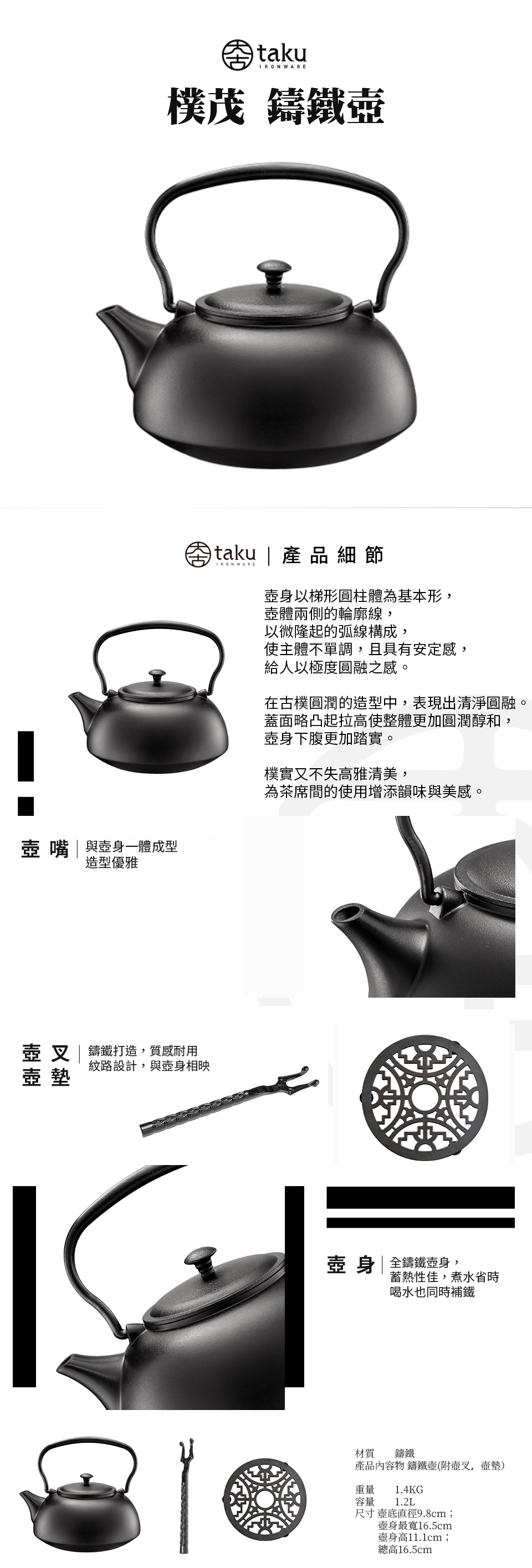 產品內容物 鑄鐵壺,附壺叉與壺墊
