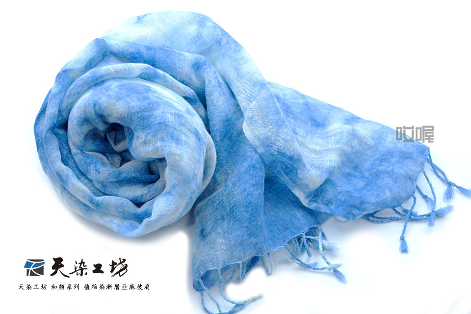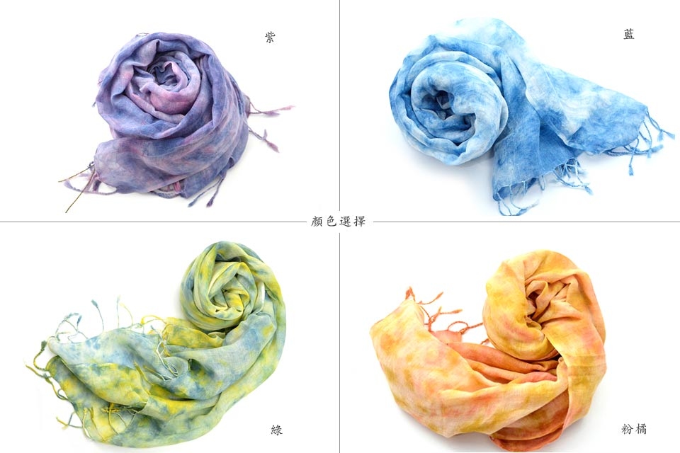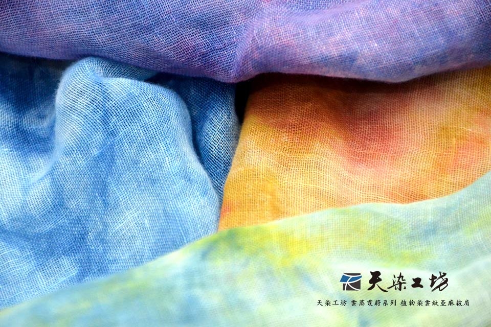 經暈染技法絞染數次,呈現出深淺色彩交疊融合的雲紋。亞麻披肩觸感極佳,