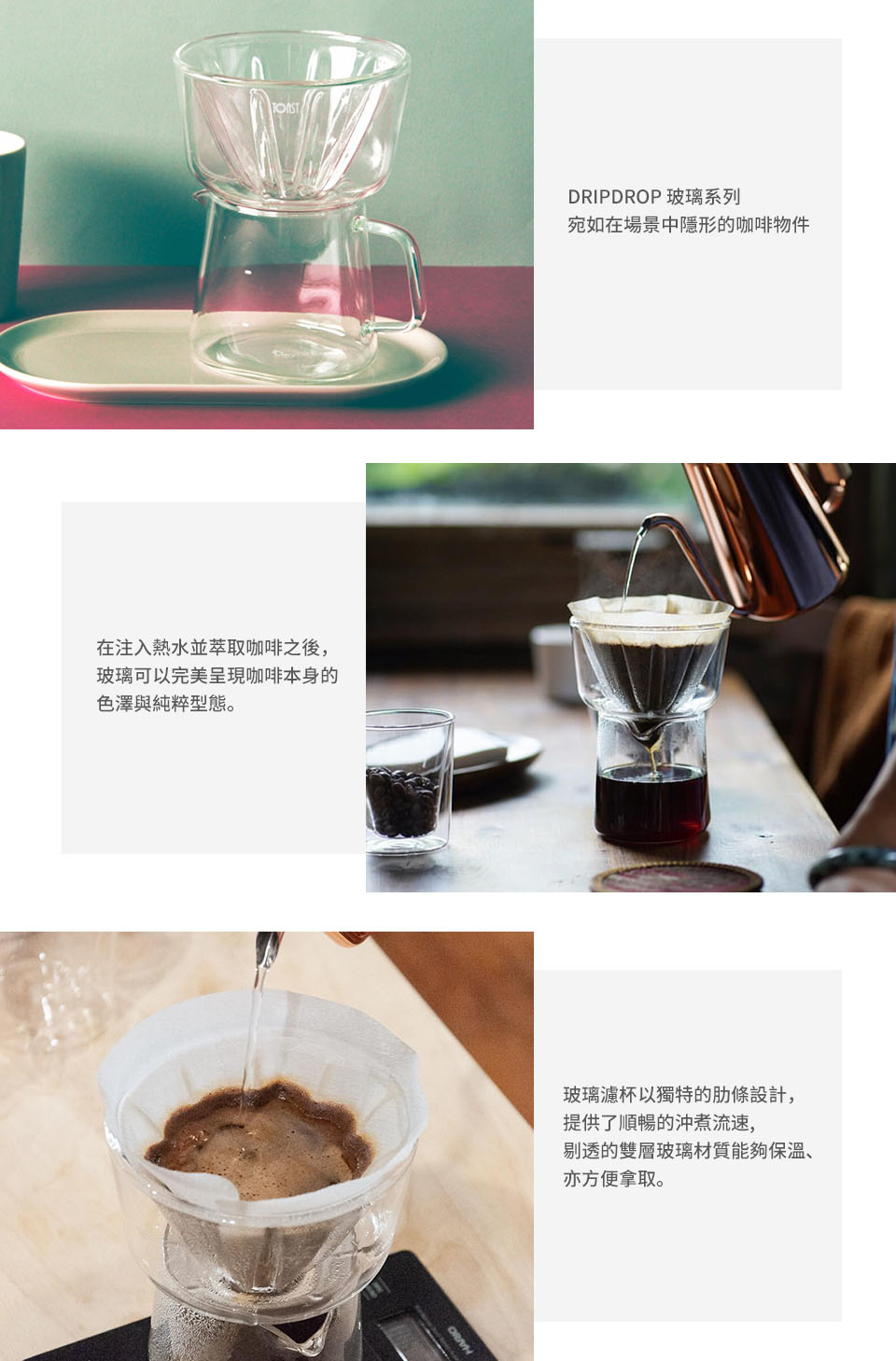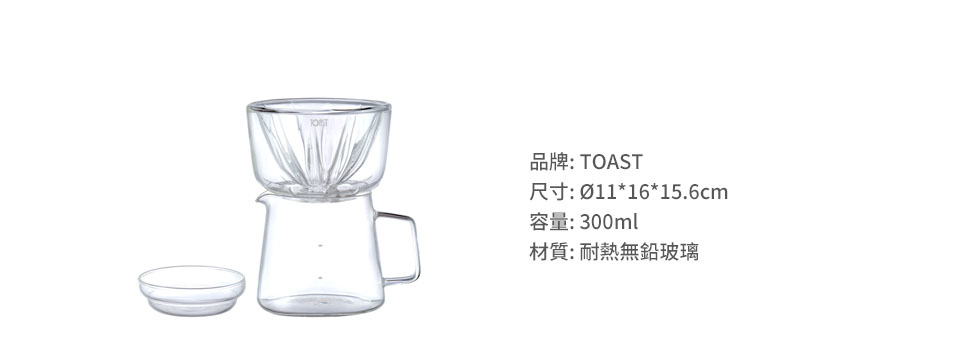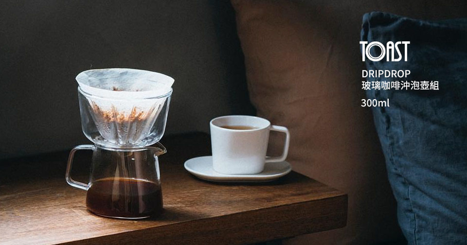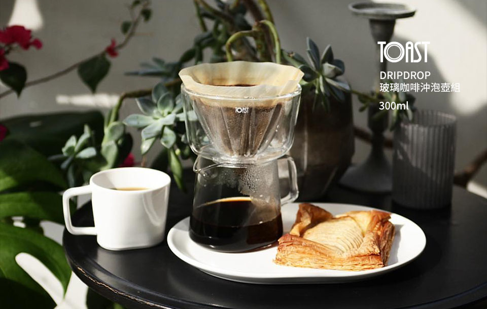 DRIPDROP 玻璃濾杯以獨特的肋條設計,提供了順暢的沖煮流速,剔透的雙層玻璃材質能夠保溫、亦方便拿取。