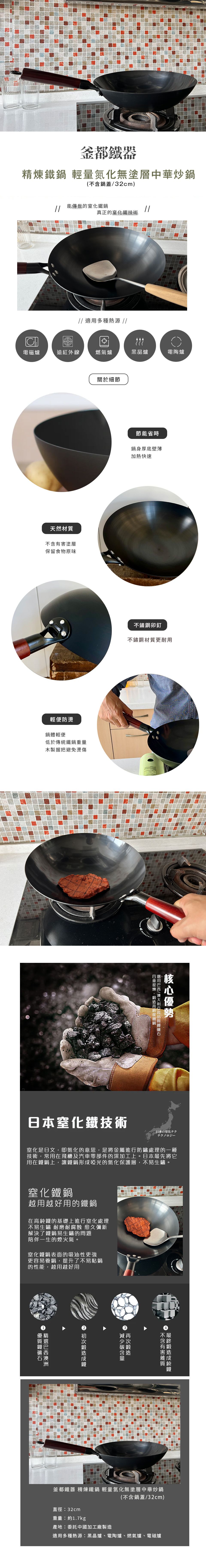 釜都鐵器 精煉鐵鍋 輕量氮化無塗層 圓釜鍋底中華炒鍋 32cm (不含鍋蓋)