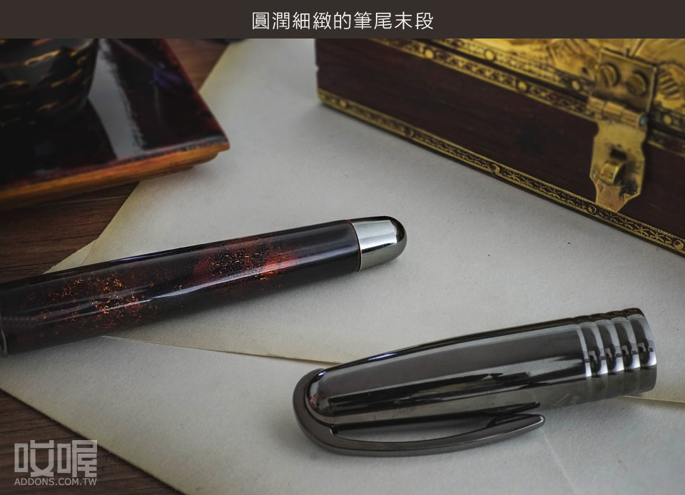 天然漆的握感是溫潤如玉,與電鍍黑合金成為絕佳視覺搭配,