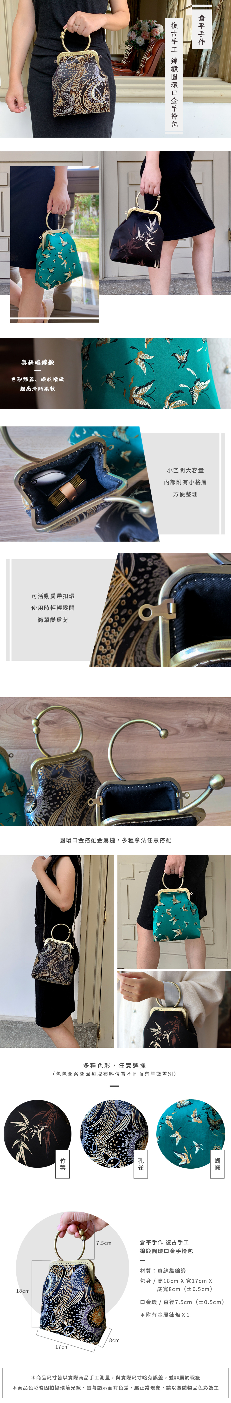 倉平手作 復古手工錦緞圓環口金包/波士頓包/隨身包/手提包 (三色可選)