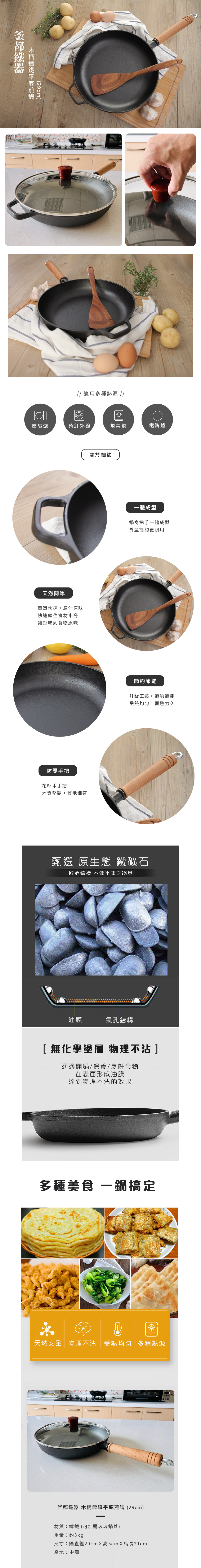 無任何化學塗層,在烹飪過程中形成油膜達成物理不沾效果,