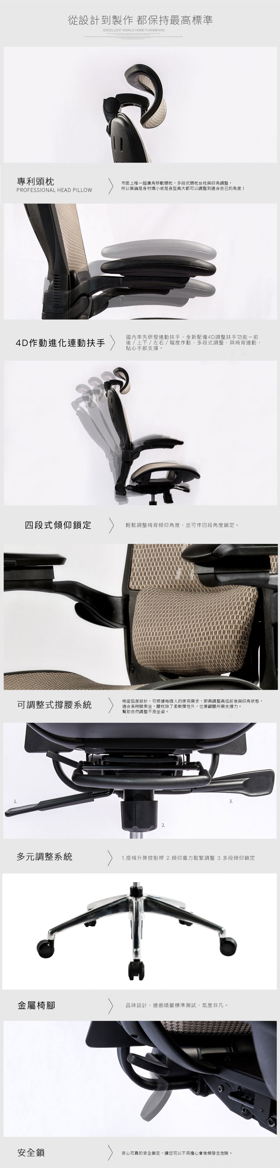 市面唯一超廣角移動頭枕,多段式頭枕台柱與仰角調整,